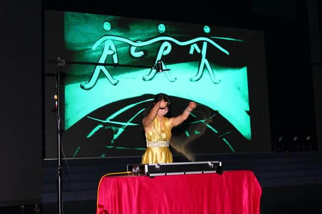 沙畫(huà)表演《艾的歷程》,在《Kiss the rain》的背景音樂(lè)下,主持人頌讀著旁白,表演者陳昱以灑、抹、擦、點(diǎn)、劃、漏、勾等各種手法在白色背景板上揮灑自如地繪制了八個(gè)惟妙惟肖的精美圖案,從開(kāi)始的艾康生物字體,到斷橋風(fēng)光,小嫩芽,參天大樹(shù),手拉手站在初生的太陽(yáng)上和艾康Logo,艾成科技園圖案及最后的“傳遞健康、傳遞艾”字樣清晰地為大家描繪了艾康的成長(zhǎng)史。