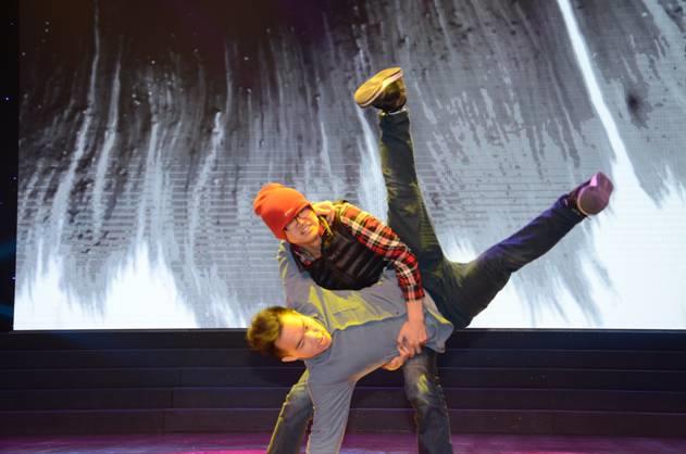 《動(dòng)感秀》匯集艾集團(tuán)旗下的艾吉團(tuán)和輝圖兩個(gè)兄弟公司的智慧結(jié)晶,正是他們的親密合作才成功演繹了這個(gè)創(chuàng)意性強(qiáng)的精彩節(jié)目,它將雙節(jié)棍和街舞表演自然地串聯(lián)起來(lái),在動(dòng)感音樂(lè)《我就是李小龍》的伴奏下,艾吉團(tuán)曹樂(lè)平的表演動(dòng)作矯健靈活,干凈利落,嫻熟地?fù)]舞著雙節(jié)棍,串接上輝圖二人的街舞表演,那是狂歡和自由的完美結(jié)合,他們用輕快的舞步,無(wú)限的激情,伴著強(qiáng)勁的節(jié)奏,舞動(dòng)著身姿,舞動(dòng)著青春,像活潑的精靈,活躍在舞臺(tái)中央。